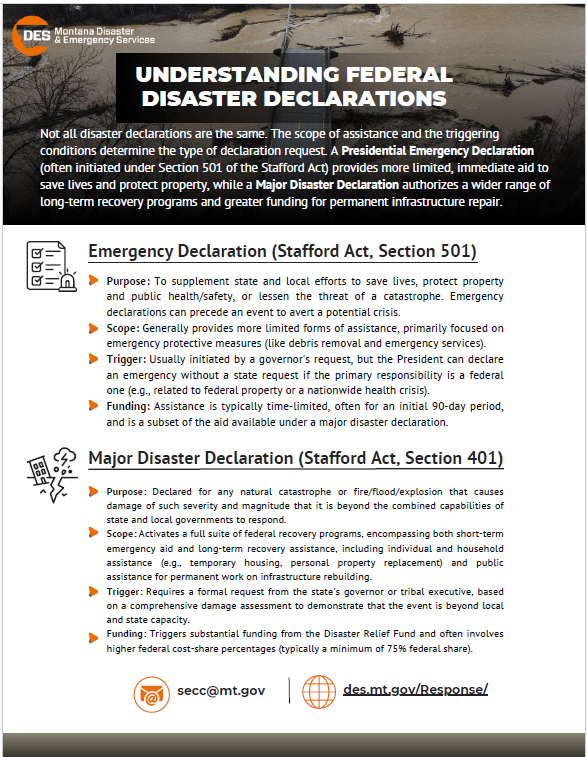 Montana Disaster & Emergency Services (MT DES) is the lead agency coordinating comprehensive emergency management in Montana. In collaboration with local and tribal governments we build, sustain, and improve our ability to prepare for, protect against, respond to, recover from, and mitigate hazards.